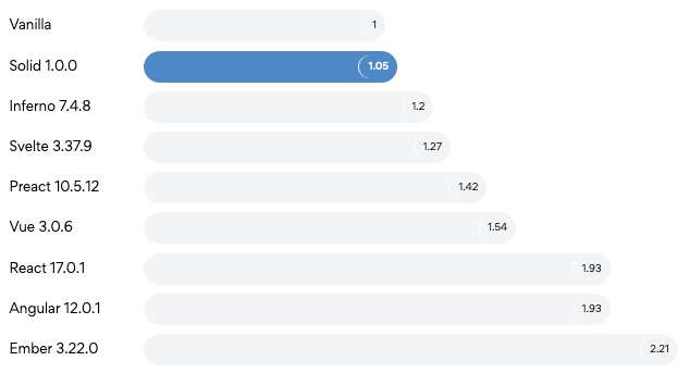 SolidJS 홈페이지에 게시된 벤치마크 결과 그래프를 보면, SolidJS 실행 시간은 바닐라 스크립트를 사용한 것과 비교해 1.05배 증가했으며, React 는 1.93배 증가한 것을 볼 수 있습니다.